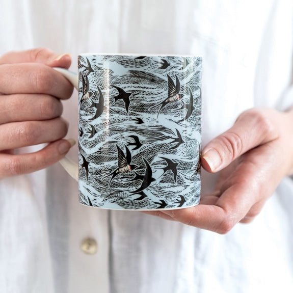 Beautiful fine bone china mug with Swallows And Sea print. Image taken from an original print by Angela Harding.