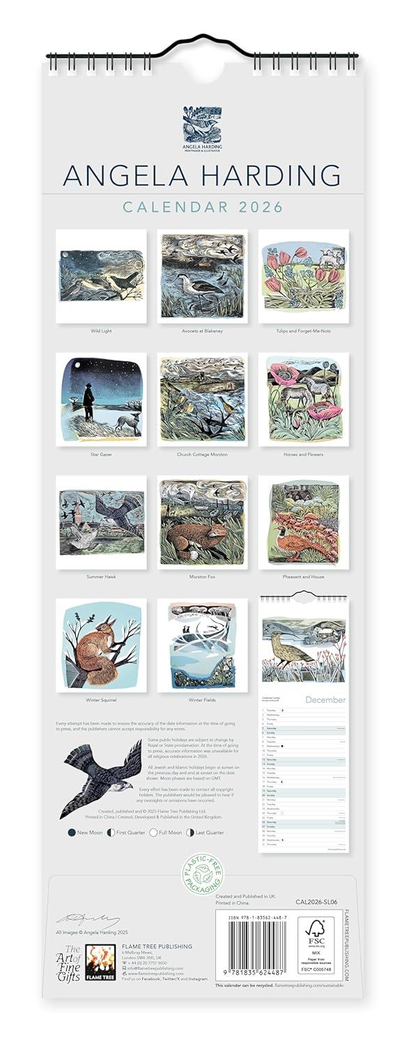 Printmaker and illustrator Angela Harding lives in the UK’s smallest county, Rutland, where she works from her garden studio in Wing. She is inspired by the wealth of natural wildlife around her to create her stunning prints. This charming slim calendar features beautiful reproductions of some of her best works. The animals she depicts are always featured in atmospheric locations which pull the viewer into the artwork. Printed on FSC-certified paper, with plastic-free packaging.