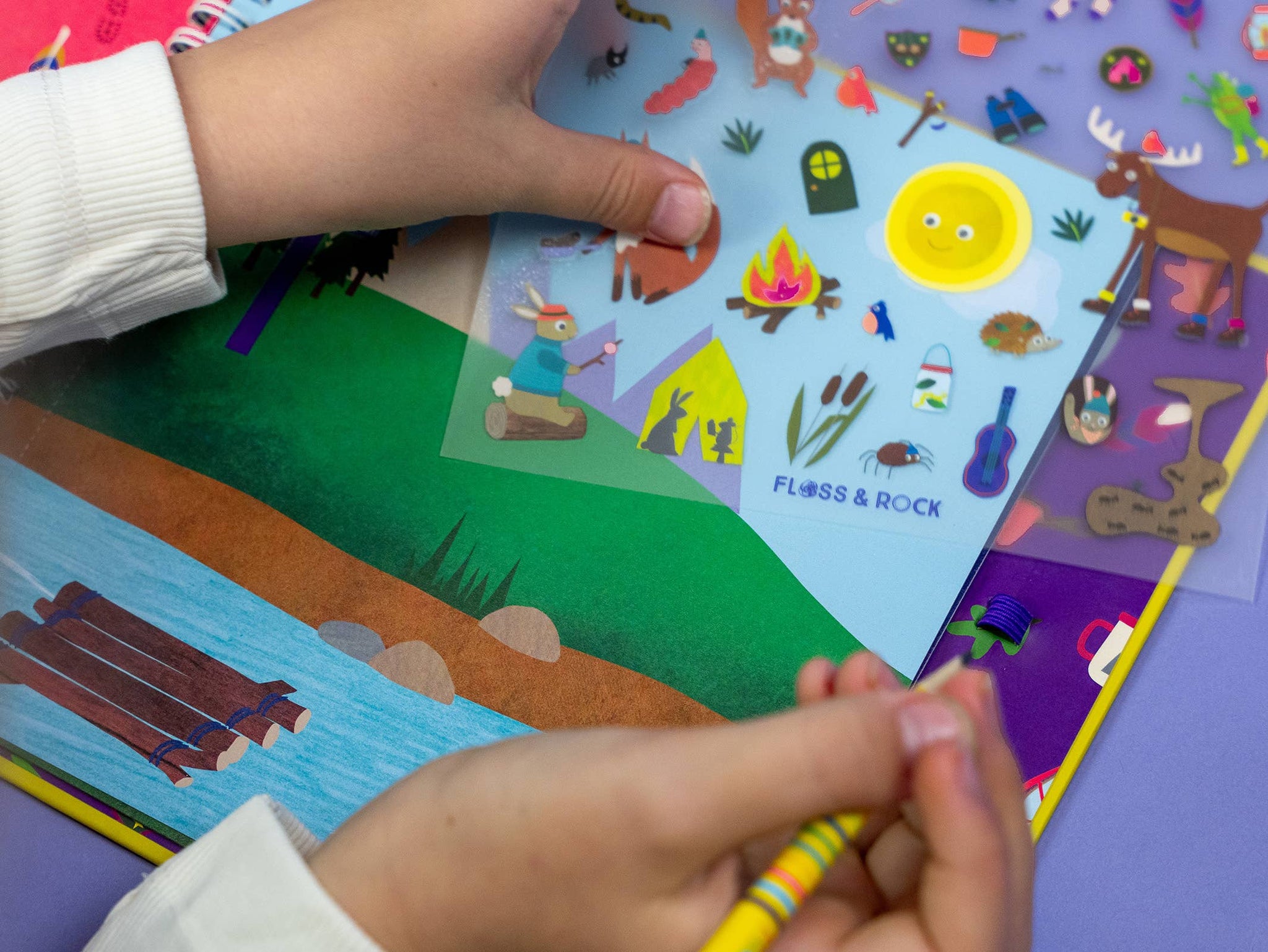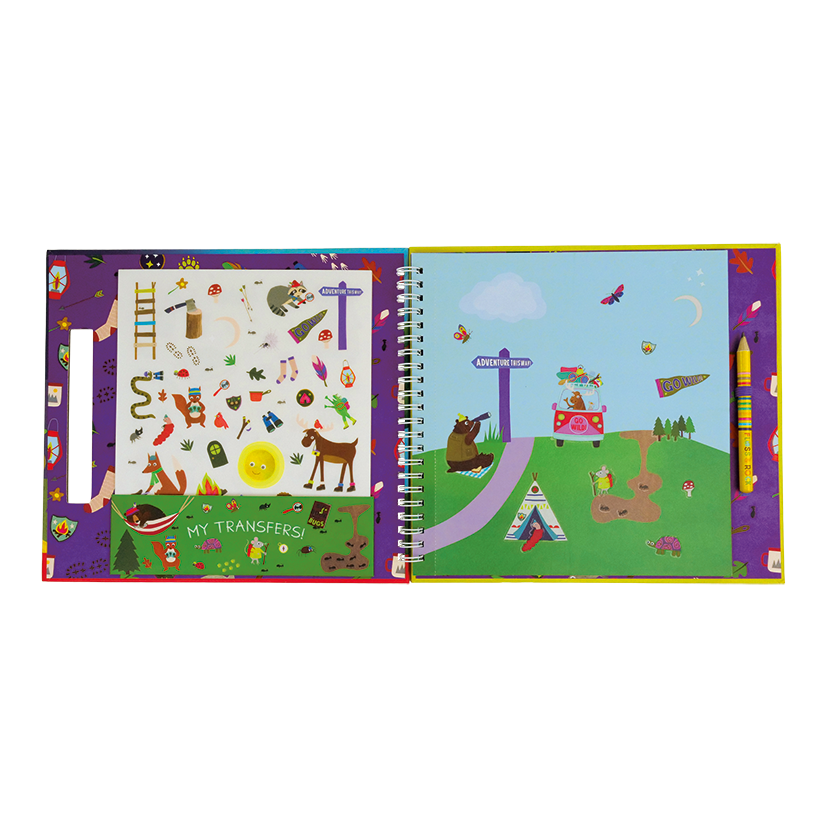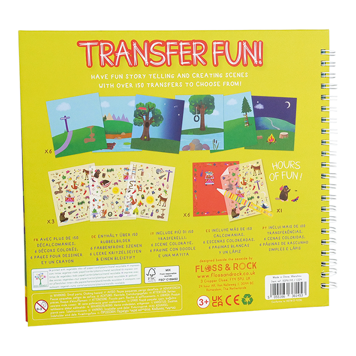 There's so much fun to be had with Transfers! This Adventure Transfer Fun comes with over 150 amazing Adventure themed transfers, 6 colourful scenes to place them onto, 6 plain pages for freestyle doodling and a pencil. Open the spiral bound book to find all your transfers neatly stored in the 'My Transfers' pocket, find your chosen illustration and flick through the pages to find the perfect scene to put them onto. Scratch over the top of the drawing with the Floss & Rock pencil provided and lift up the sheet, like MAGIC you'll find them transferred onto the page. Spend many happy hours sparking creativity and making beautiful pictures with campervans, woodland pals and more!