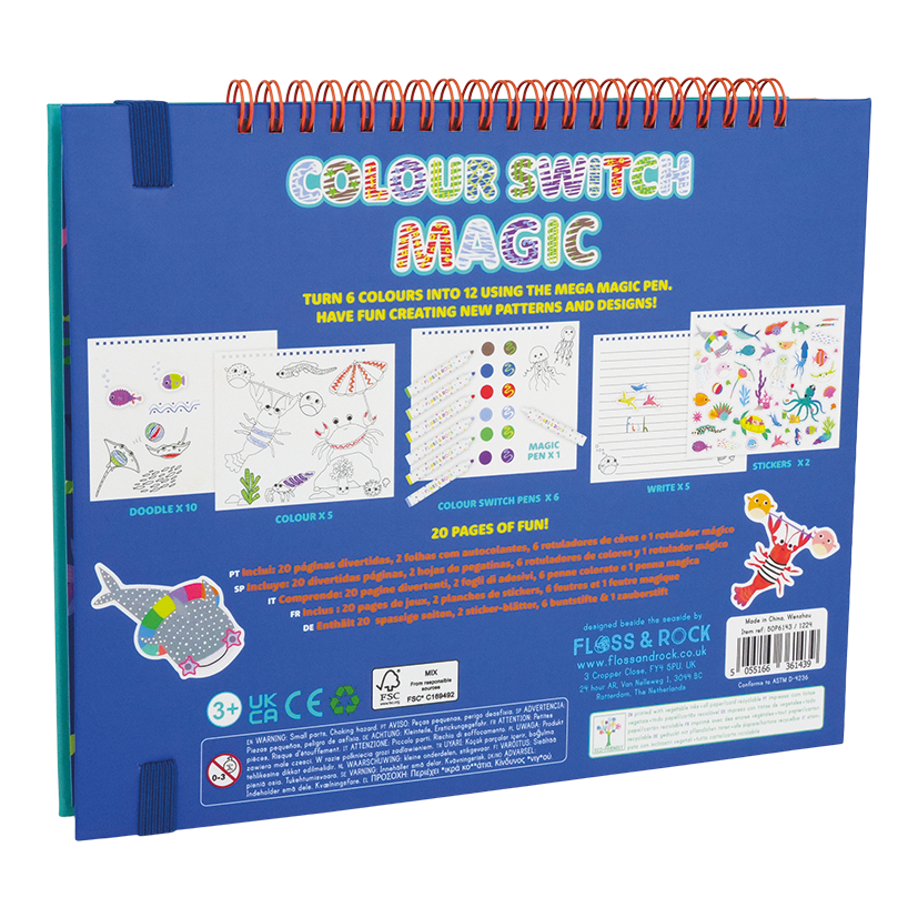 Double the fun with Colour Switch Magic! The magic white pen turns 6 colours into 12, resulting in hours of fun creating patterns and more. Each pad contains 10 doodle pages, 5 colour-in pages, 6 colour switch pens, 1 magic pen, 5 lined pages for writing and 2 sticker pages. Colour Switch Magic is unique as not only do you get the super fun colour changing pens and mega magic white pen - you also get a ring bound book packed full of fun! Use the lined pages to write words and sentences, use the magic white pen to make the letters stripey or multicolour, let loose on the doodle pages and discover endless creative possibilities! Embellish your creative pages with fun stickers in the theme of Colour Switch Magic book. Perfect for experimenting and developing writing, drawing and colouring skills.