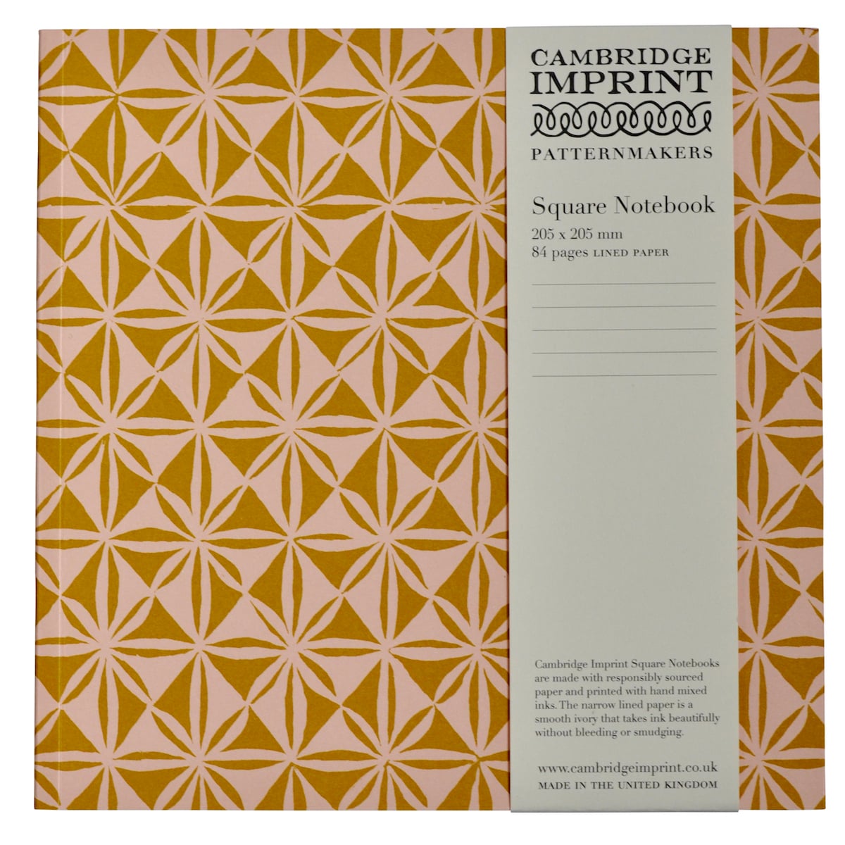 Cambridge Imprint square exercise books containing 84 pages of smooth cream paper with an elegant narrow-spaced line. There is no label or branding on the cover of patterned card – just our name stamped discreetly on the inside back cover.