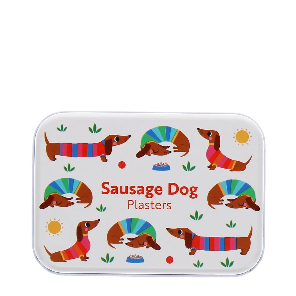 Pack of 30 colourful plasters, each featuring a sweet design with sausage dogs out in the sunshine. The perfect remedy for little ones' minor cuts and scrapes. Neatly stored in a matching metal tin, ideal for keeping them safe and at the ready in the medicine cabinet, or in a bag when out and about.