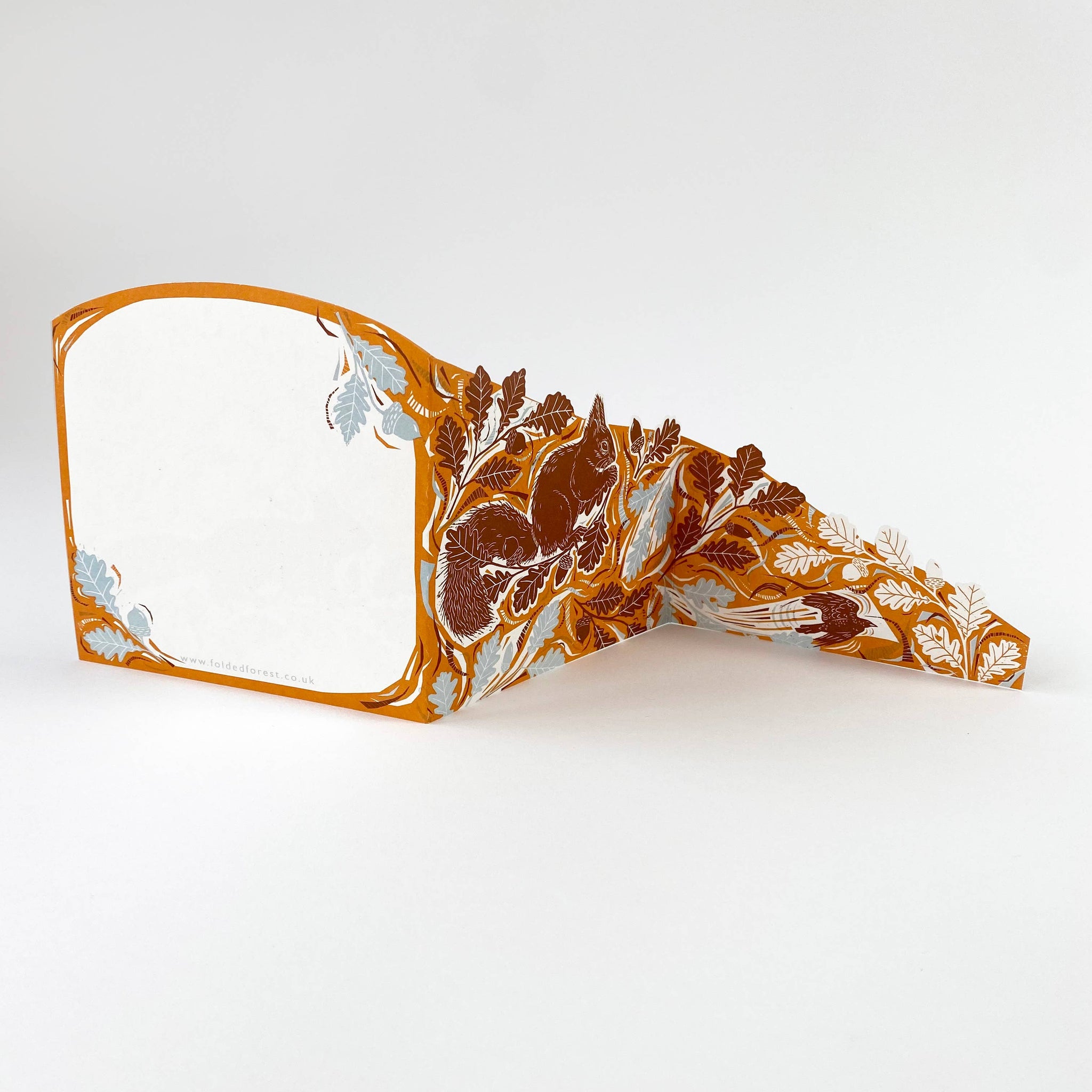A fold out concertina card which opens to reveal squirrels hiding amongst the leaves and birds swooping through the autumn skies