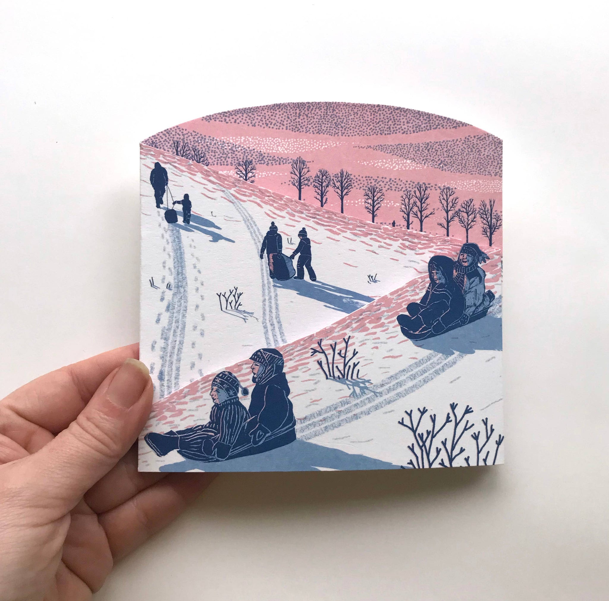 A fold out concertina card which opens to reveal a snowy sledging scene against a sunset sky. Inspired by childhood memories of snowy days, staying out sledging all day until the sun sits low casting pink & purple shadows across the snow. Freezing fingers and toes but staying out for ‘just one more’ exhilarating whoosh down the hill, then walking home in the dark to warm up with hot chocolate in front of the fire…