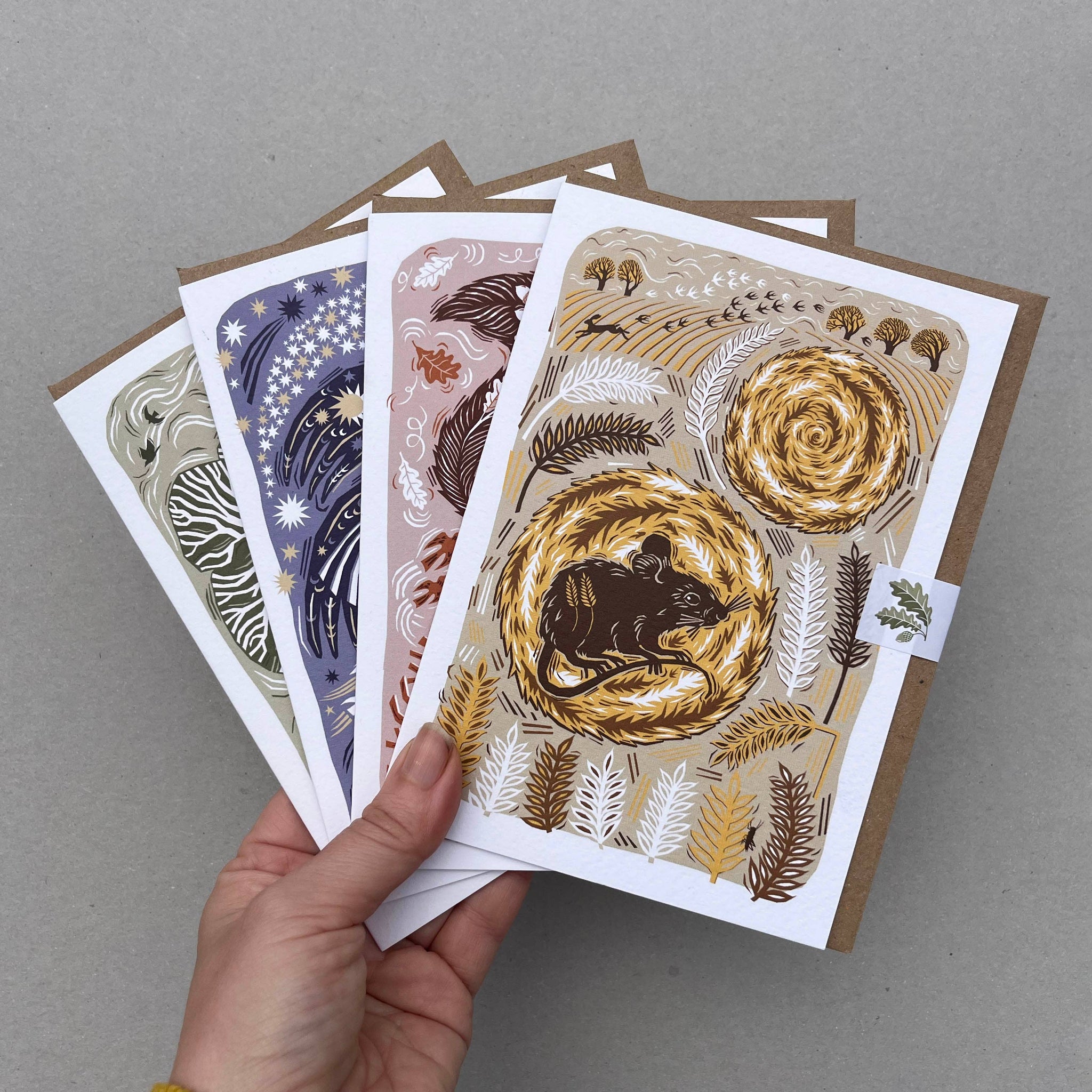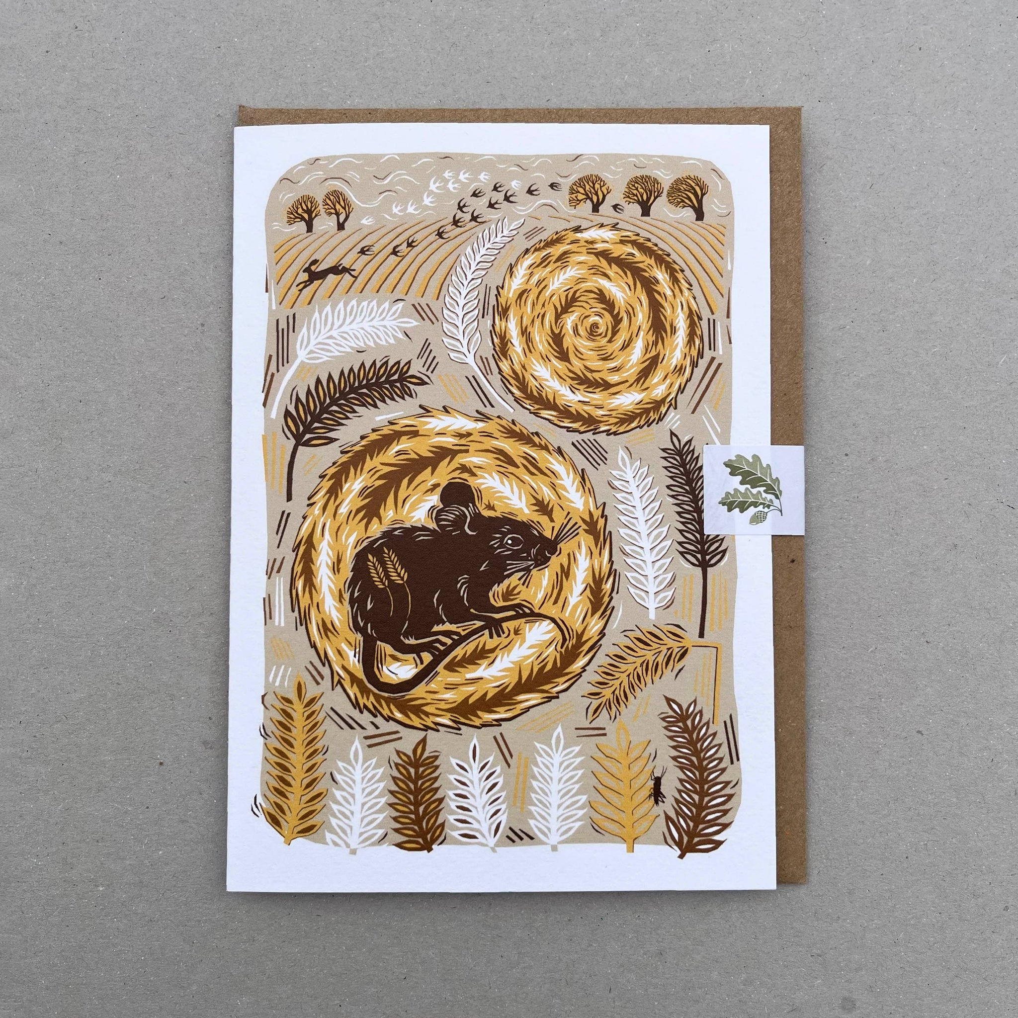 A card inspired by harvest time. A field mouse resting inside a bale and a hare leaping across the freshly mown fields. A card from the range of designs celebrating quiet stories of the natural world