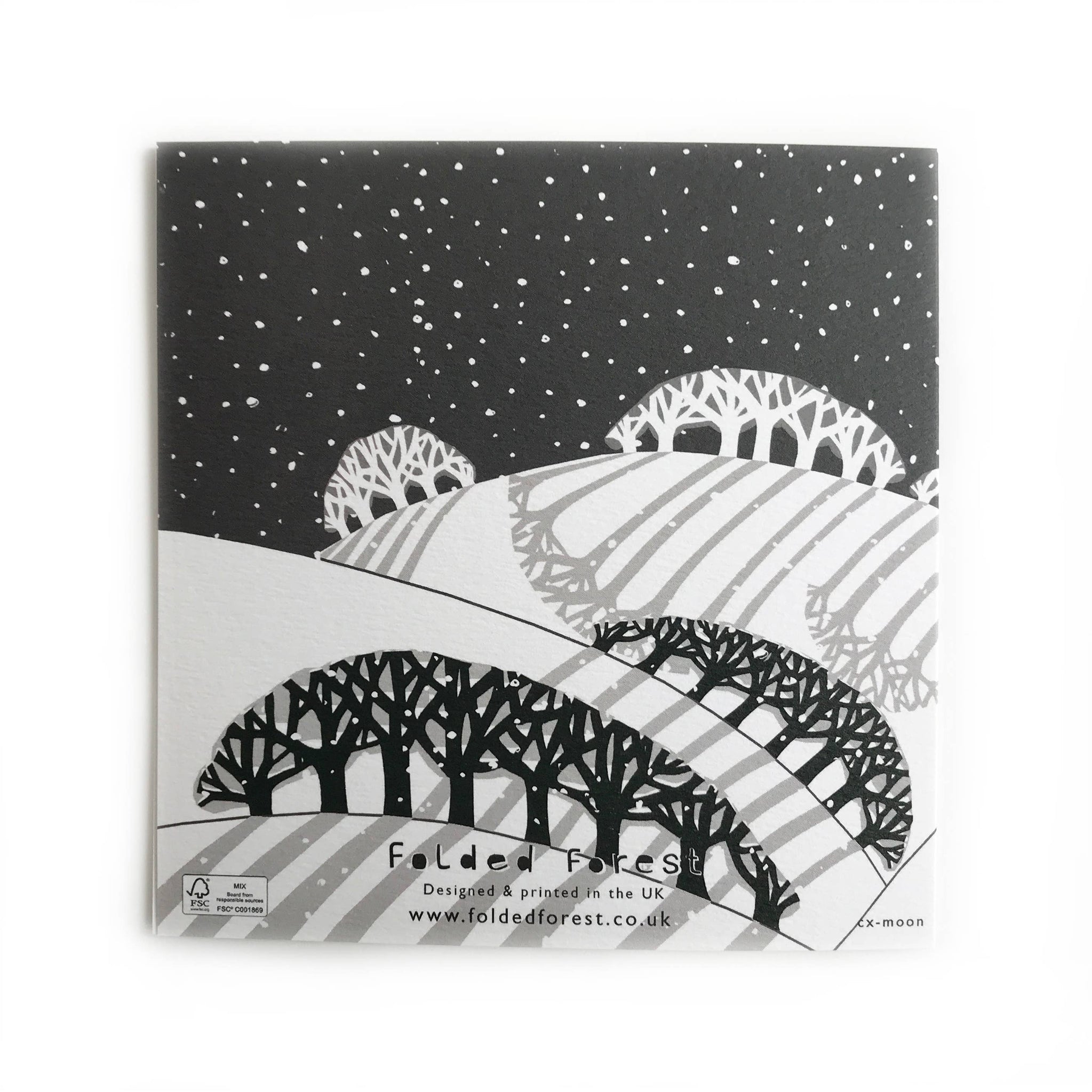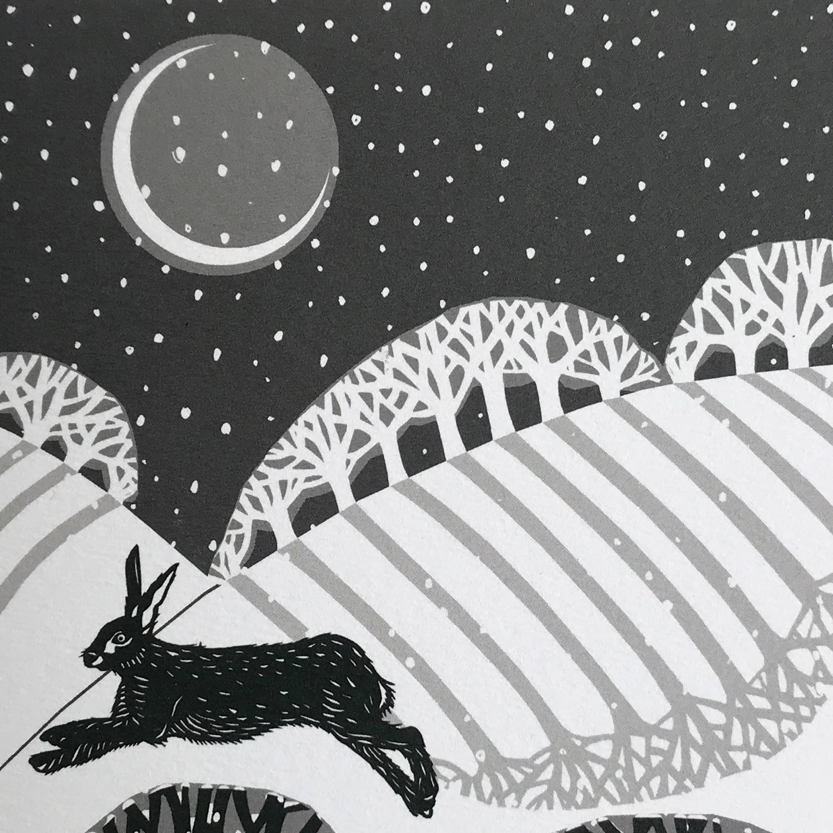 A greetings card featuring a hare leaping across the moonlit snow. From our range of designs celebrating the quiet stories of the natural word. Based on the original detailed paper cut design and perfect for seasonal card sending and Christmas. The design wraps around the card to fill the reverse