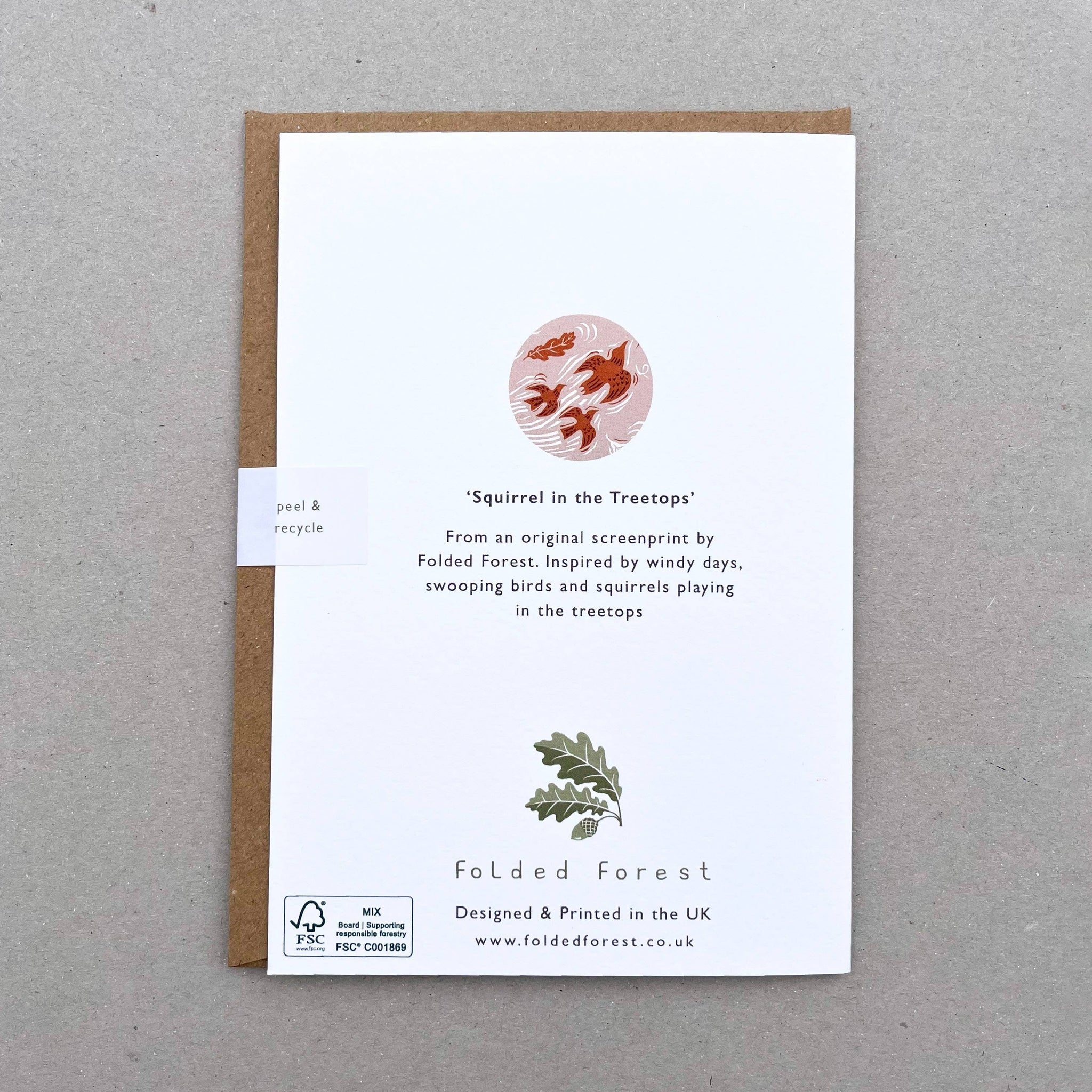 A card inspired by windy autumn days; a playful squirrel dances amongst the treetops whilst birds swoop in the sky above. From the range of designs celebrating quiet stories of the natural world.