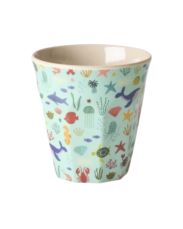 Enjoy every sip with our blue medium cup... it’s brimming with jellyfish, sharks and starfish and it’s made of the practical material melamine – perfect for those small curious hands! Melamine is durable and ideal for daily use due to its strength and easy cleaning.