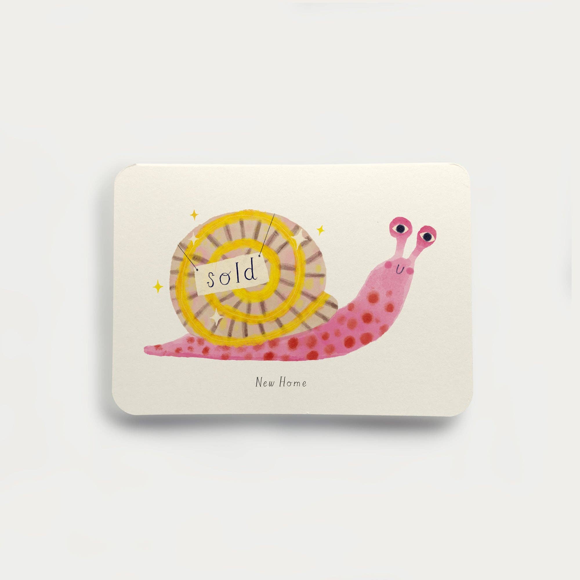 Illustrated greeting card of a snail with a sold sign on their shell and the wording 'New Home'. Blank inside for your own message. Printed in the UK, on sustainable and ethically sourced 320gsm ivory card stock with rounded corners. Packaged with a brown Kraft envelope bound with removable low-tac Oldfield Design Co sticker. Dimensions: 10.5cm x 14.8cm (folded) / 4.1" x 5.8" inches Designed in Cumbria, home of the Lake District.