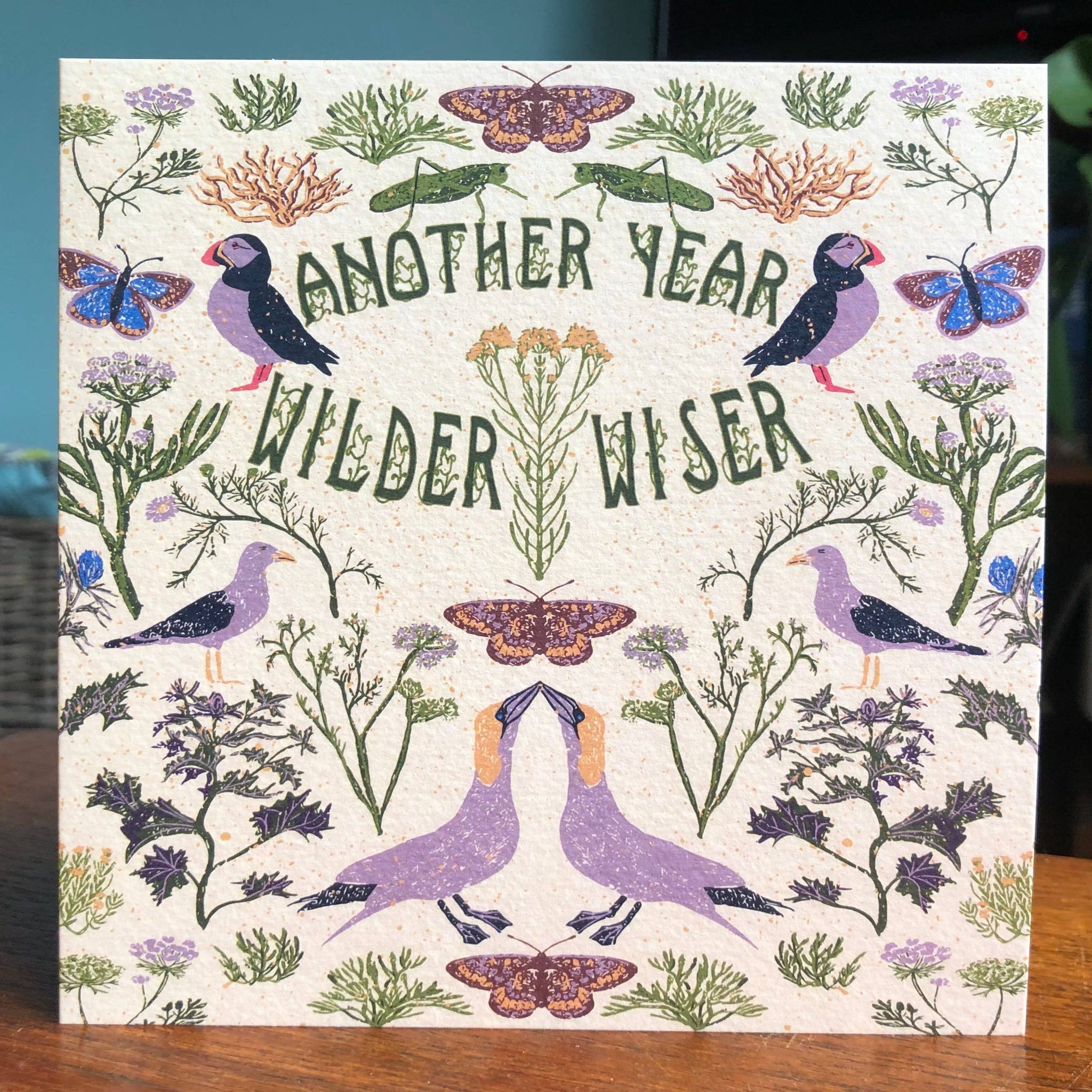 This birthday card celebrates British coastal wildlife with the words ‘Another Year Wilder Wiser’ arranged in a symmetrical seaside composition.