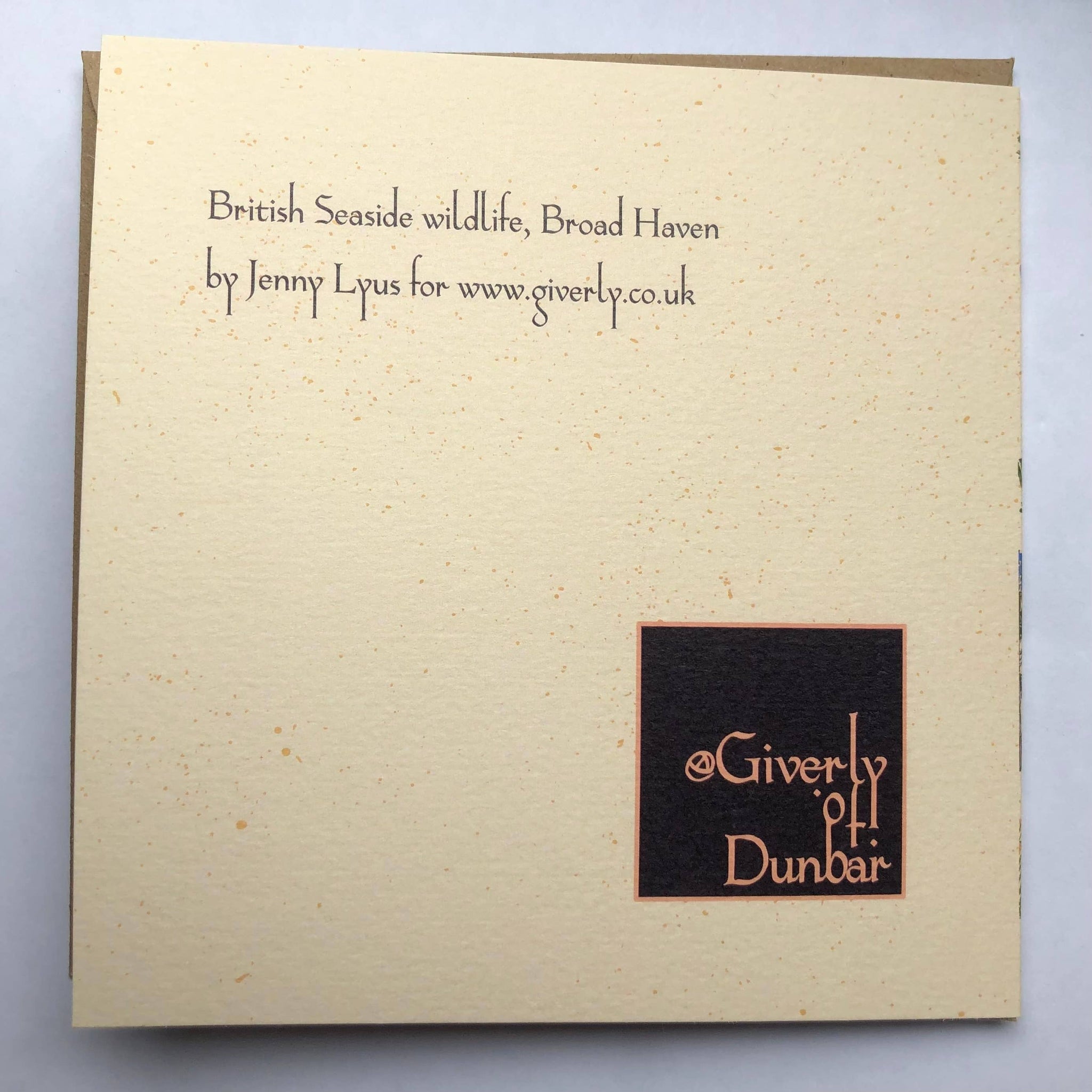 The illustration shows Atlantic puffins, lesser black-backed gulls, northern gannets, common blue and marsh fritillary butterflies among sea holly, golden hair lichen, tubular water-dropwort, sea mayweed, rock samphire and goldilocks aster. The design represents Broad Haven on the Welsh Pembrokeshire coast but also reflects East Lothian’s similar Scottish shoreline species, where the artist lives. Drawn in a digital block-print style with fine linework and flat colour, it captures the humour and renewal of growing wilder rather than older. Part of Giverly’s Great British Cottagecore Off collection.