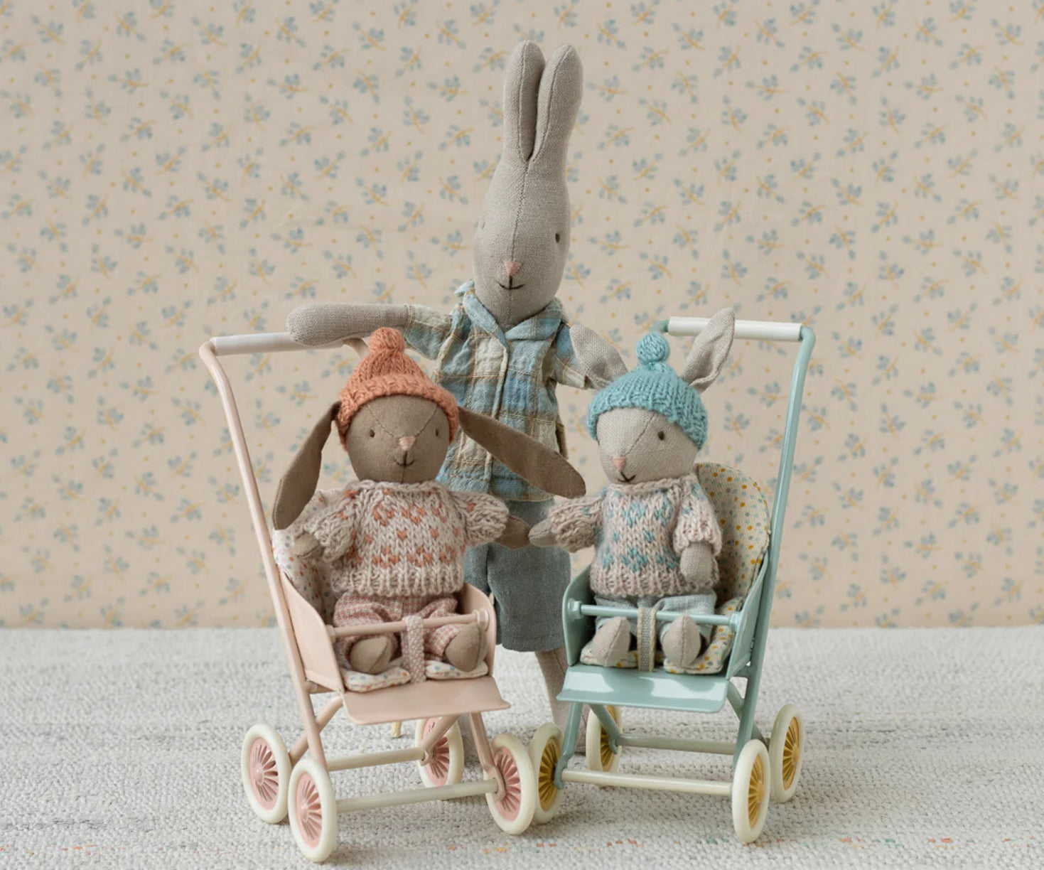 Let the storytelling and hours of play begin with this soft bunny. It fits Maileg accessories in size micro perfectly and can live in the House of miniature dollhouse. This bunny size is also perfect on the go so you can bring the magic everywhere.
