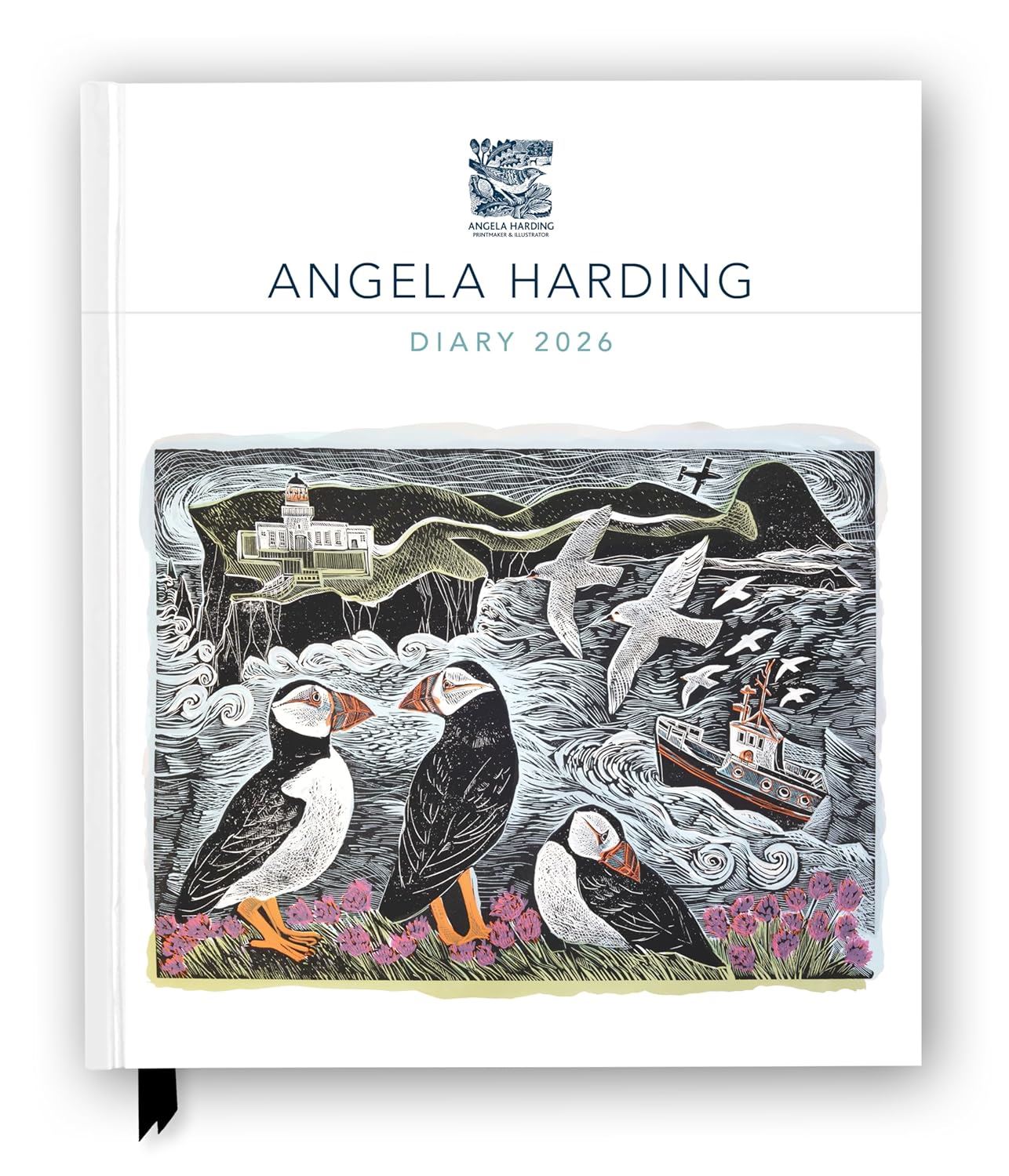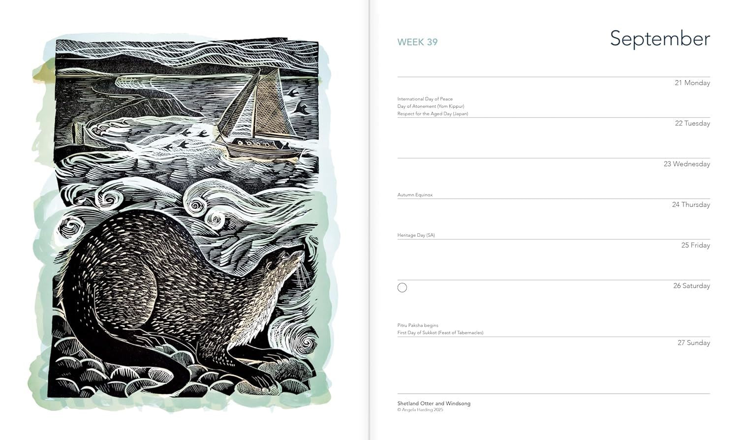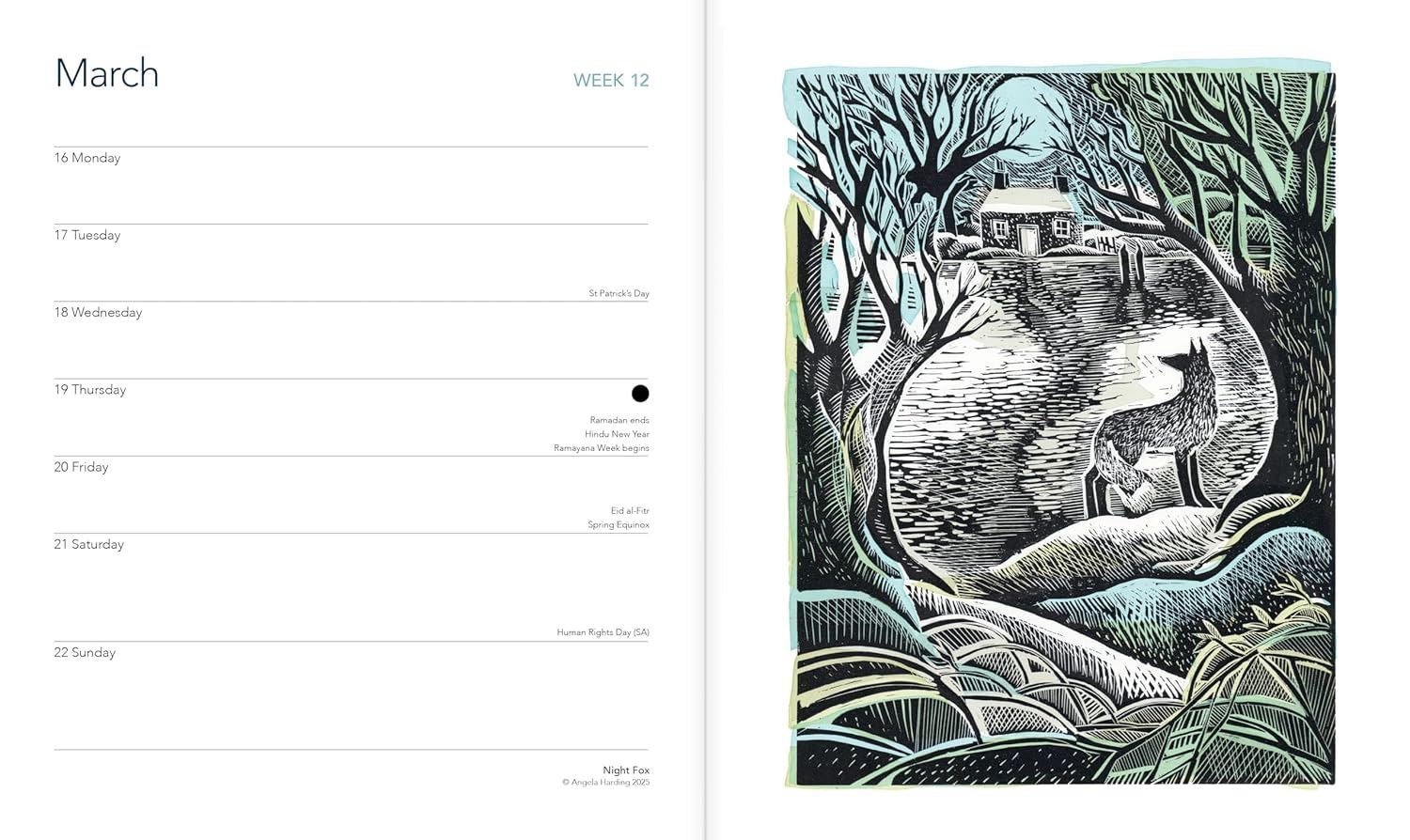 Printmaker and illustrator Angela Harding trained in Fine Art at Leicester Polytechnic and Nottingham Trent University. She now lives in the UK’s smallest county, Rutland, where she works from her garden studio in Wing. She is inspired by the wealth of natural wildlife around her to create her stunning prints. This week-to-view desk diary, printed on FSC-certified paper, features more than 30 of her lovely artworks.