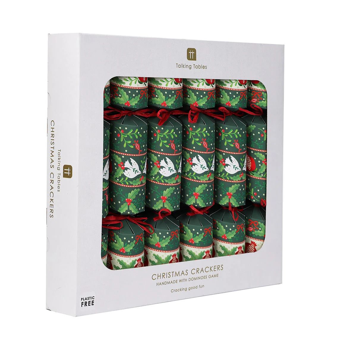 These new Folklore crackers take inspiration from Eastern fairytales and feature a hand painted design of doves, holly and pomegranates. Ideal for family Christmas dinners, as well as work Christmas parties, these full-size crackers are recyclable and are handmade. They include a dominoes game designed by Talking Tables' in-house games team for added table fun.