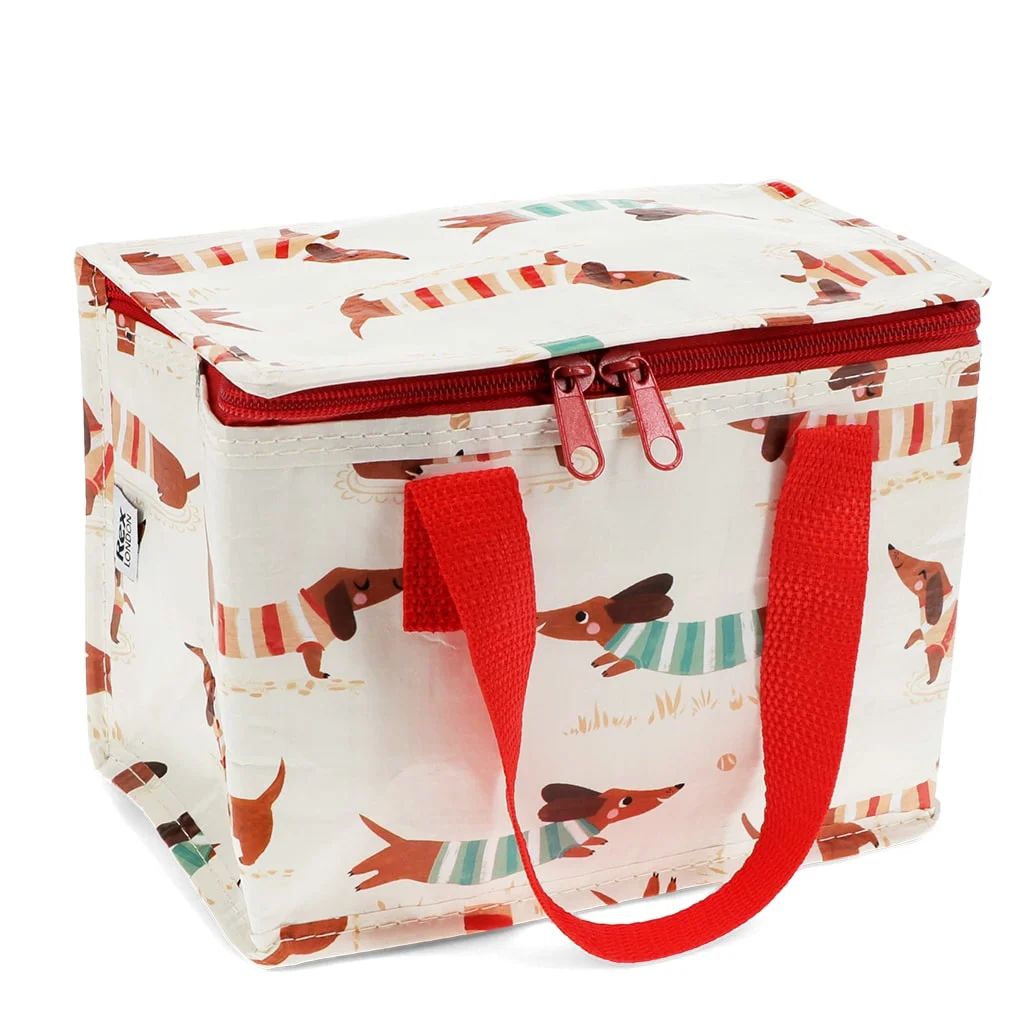 Insulated lunch bag in ivory, adorned with cute sausage dogs.